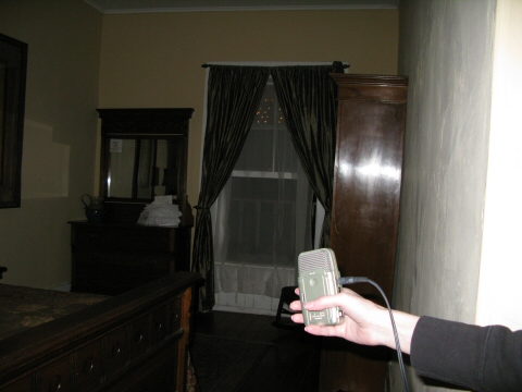 Not surprisingly, we weren't able to catch any EVPs during the investigation. The only unusual K2 activity occurred, strangely, after the guests next door accidentally set the fire alarm off with their smoky fireplace. Could the spirits who reportedly died in a fire have been "awakened" by this disturbance? We got K2 hit after K2 hit as the devices were set down in Room 2, yet we feel that the energy may have been residual, or synthetic, as our questions weren't clearly being answered. In the room next door, Room 3, there was also K2 activity, but it had very consistent peaks, indicating that it was picking up on some mechanical device possibly below the room.