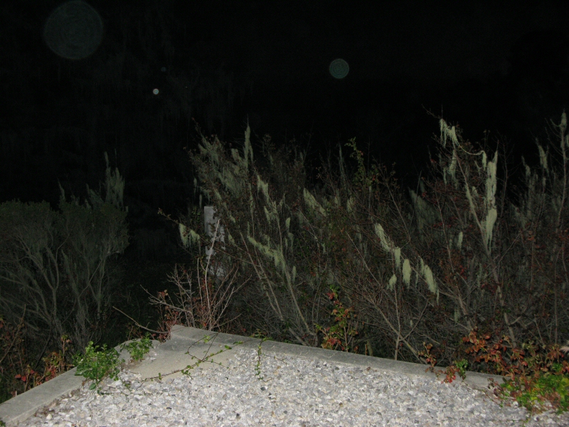 Moisture manifests in a variety of ways in photographs. Sometimes we can see it with our own eyes, and sometimes only the camera can capture it. Moisture is often mistaken for paranormal entities by people not familiar with what it looks like. The photograph shows moisture in the air caused by the breath of the person taking the photo. Because it was dark, the moisture wasn't seen except when captured with a flash. Another culprit is fog. This occurs a lot along the coast, in the mornings, or any other location prone to high water concentration in the air. Especially when using a flash, the light bounces off the water molecules and reflects back into the lens, resulting in glowing "orbs".